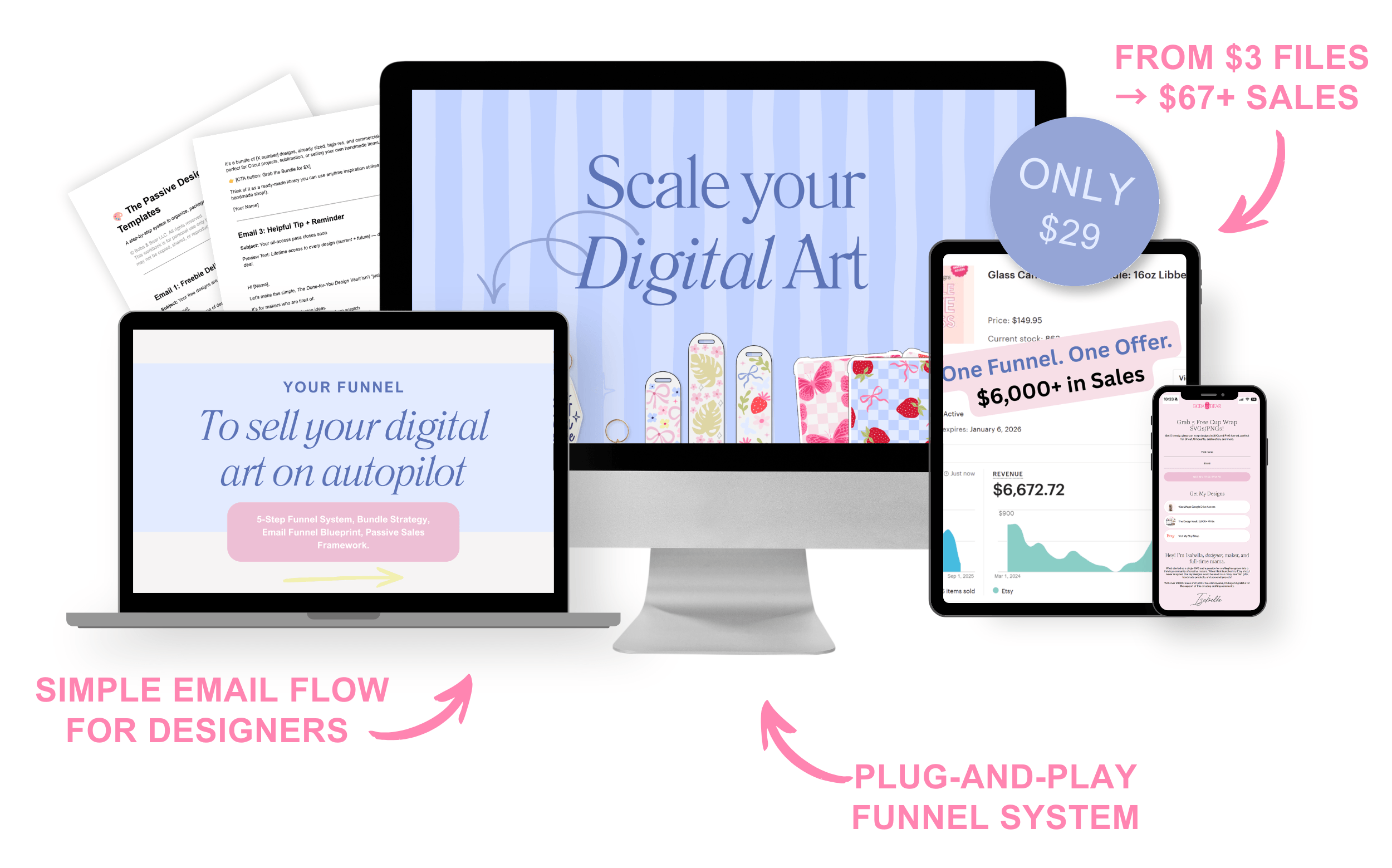 You’ll learn how to build the funnel behind your shop, the emails, setup, templates, and strategy that turn your designs into sales.