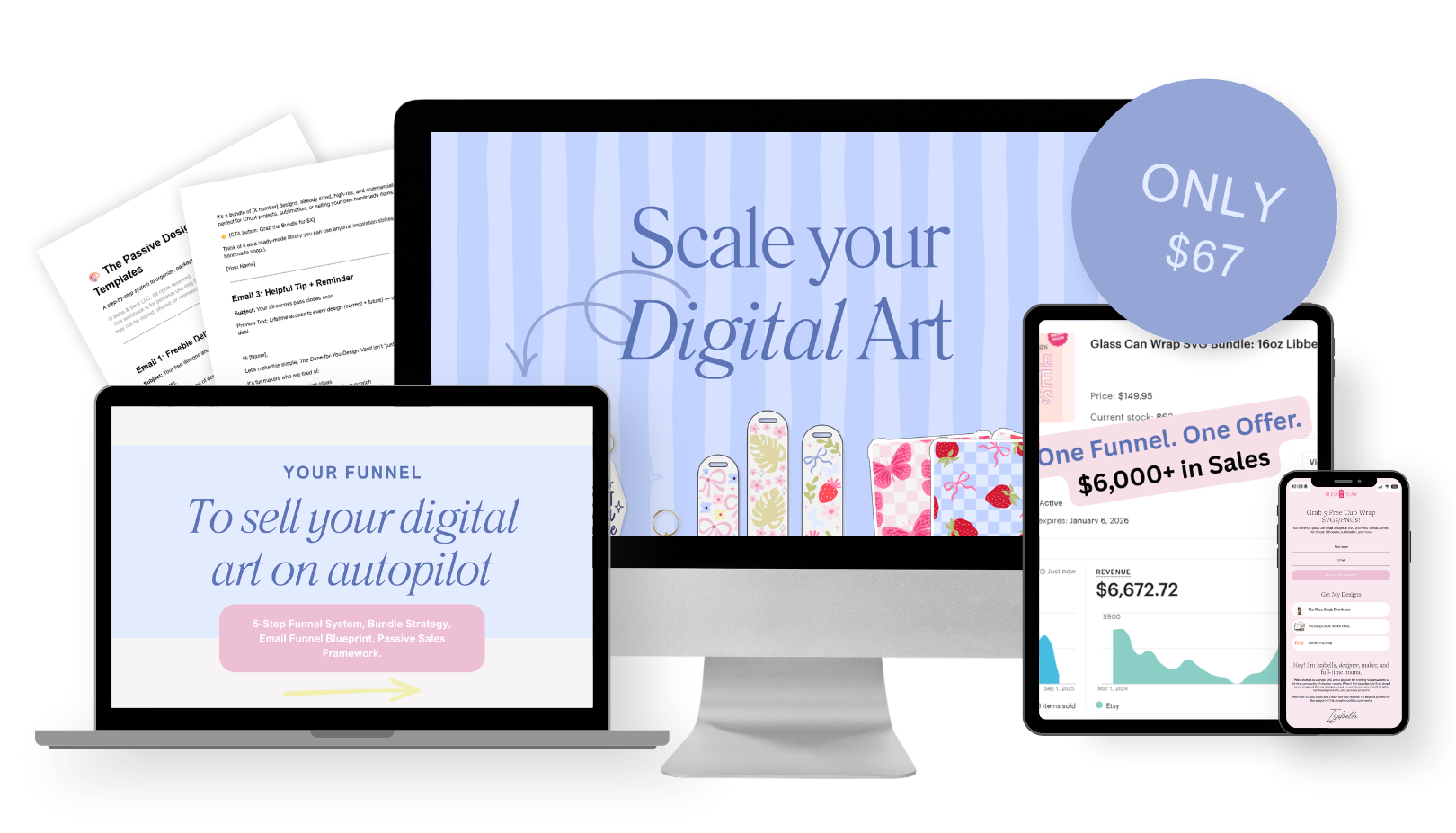 You’ll learn how to build the funnel behind your shop, the emails, setup, templates, and strategy that turn your designs into sales.